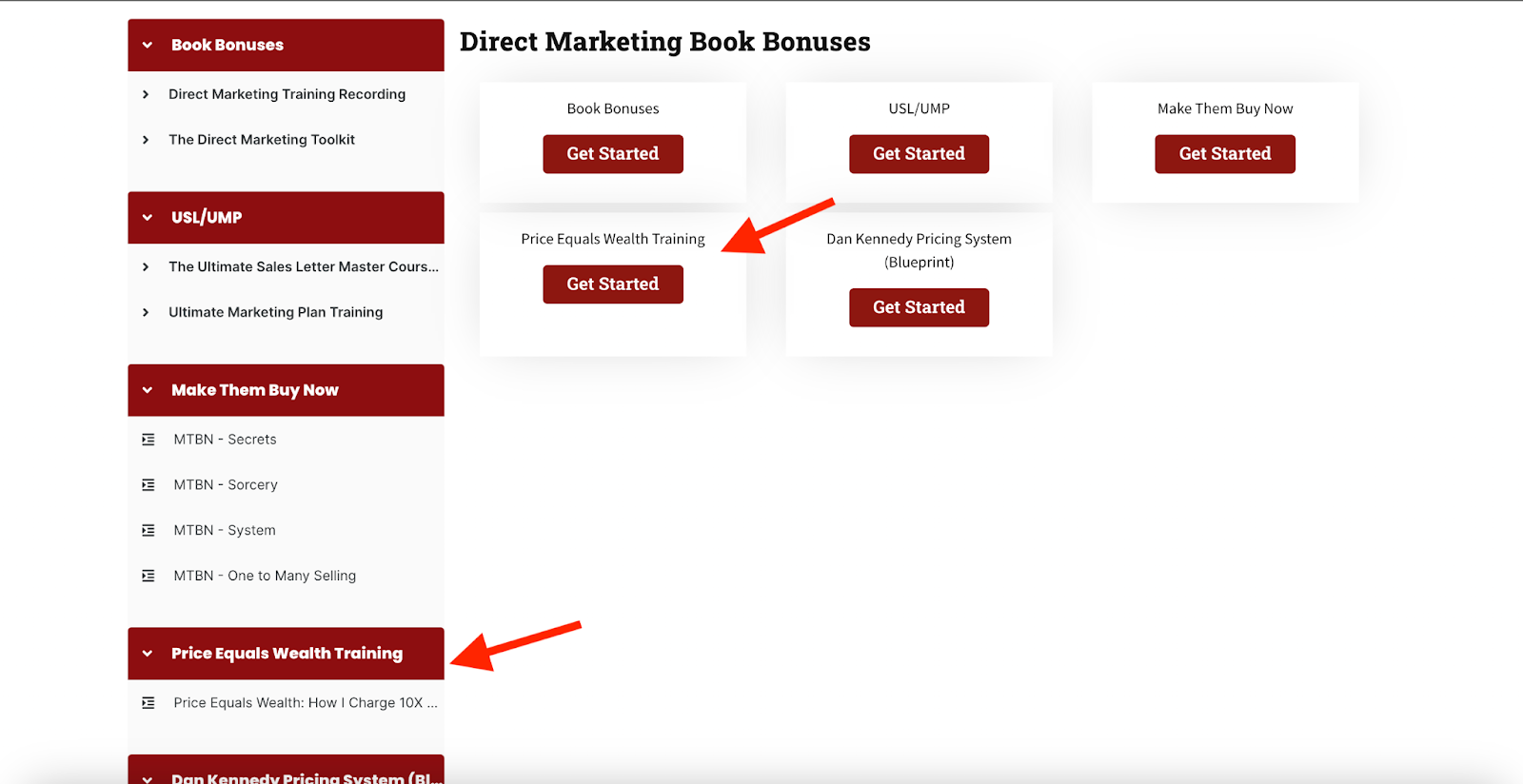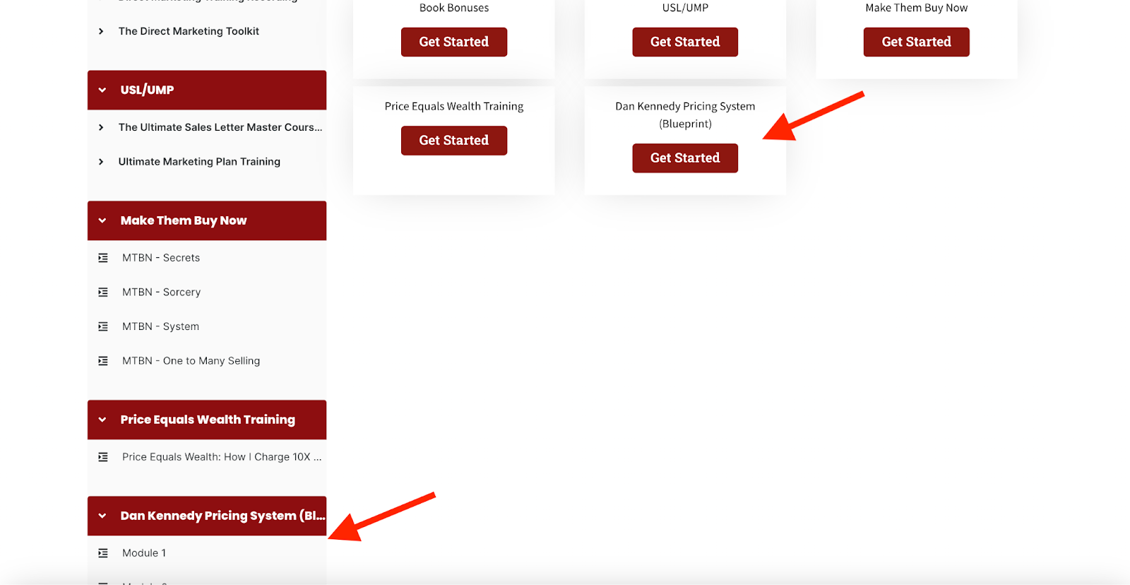 2. Click on Get Started under the DAN KENNEDY PRICING SYSTEM or on the left-side navigation.