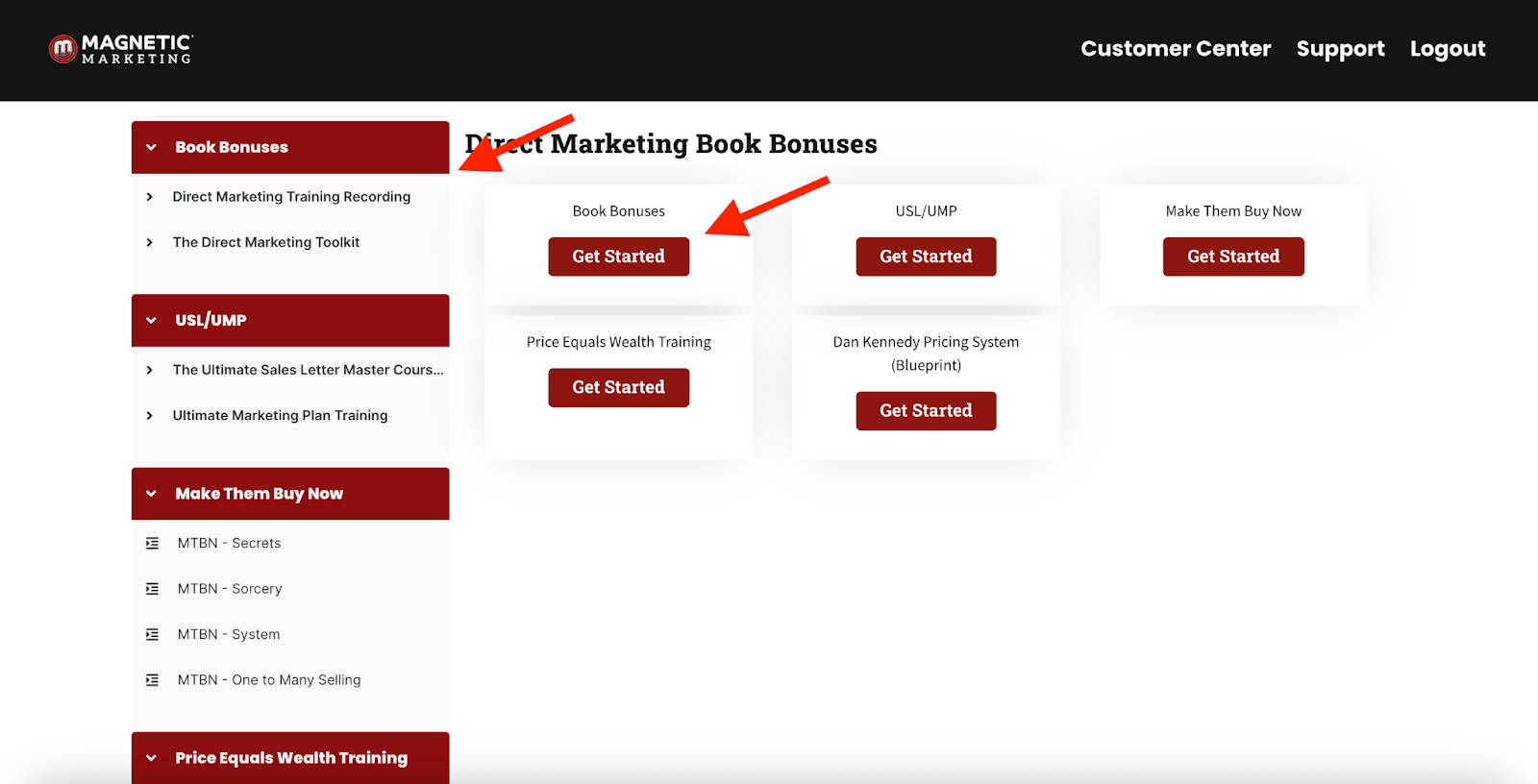Click on Get Started under BOOK BONUSES or on the left-side navigation.