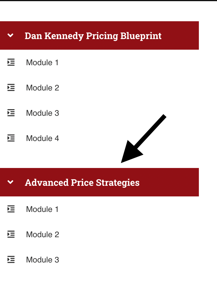 The Advanced Price Strategies course is located inside the Dan Kennedy Pricing Blueprint course. Once you login using your magic link to the Dan Kennedy Pricing Blueprint you will find the course on the left side of the page. As in the image below.